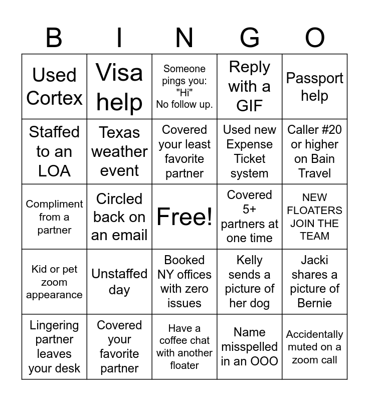 This bingo card has a free space and 24 words: Unstaffed day, Covered your favorite partner, Covered your least favorite partner, Lingering partner leaves your desk, Passport help, Used Cortex, Staffed to an LOA, Visa help, Covered 5+ partners at one time, Booked NY offices with zero issues, Used new Expense Ticket system, Compliment from a partner, Kelly sends a picture of her dog, Jacki shares a picture of Bernie, Texas weather event, Name misspelled in an OOO, NEW FLOATERS JOIN THE TEAM, Someone pings you: "Hi" No follow up., Caller #20 or higher on Bain Travel, Circled back on an email, Accidentally muted on a zoom call, Kid or pet zoom appearance, Reply with a GIF and Have a coffee chat with another floater.