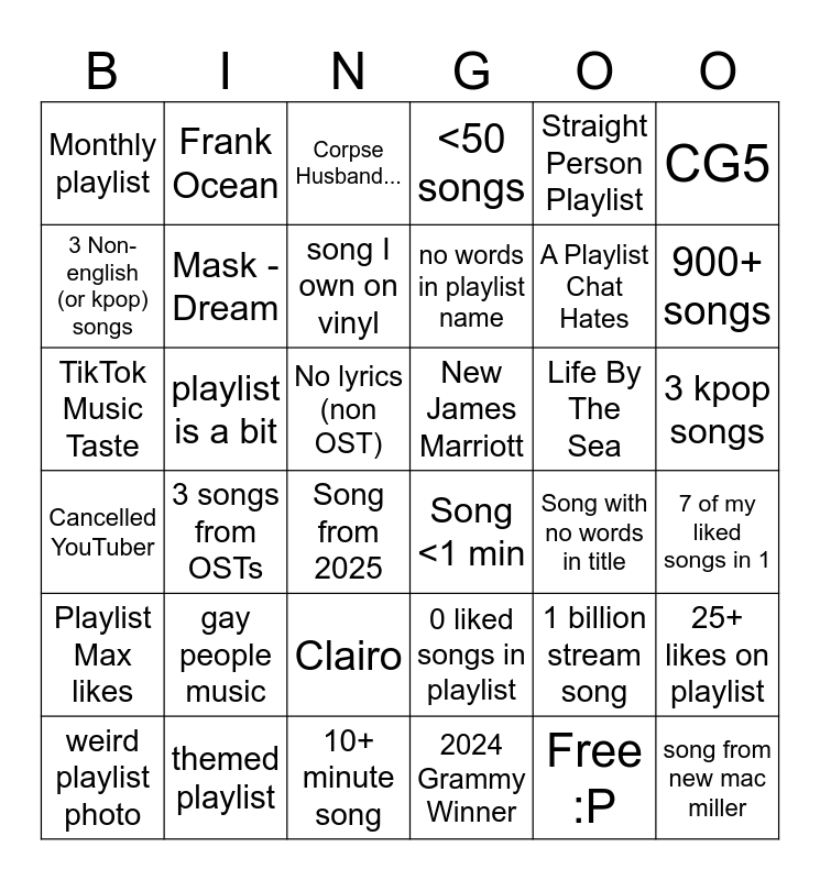 This bingo card has 36 words: 0 liked songs in playlist, Clairo, 2024 Grammy Winner, 3 Non-english (or kpop) songs, Cancelled YouTuber, New James Marriott, Mask - Dream, 10+ minute song, Straight Person Playlist, 1 billion stream song, 900+ songs, <50 songs, 25+ likes on playlist, playlist is a bit, no words in playlist name, Monthly playlist, Playlist Max likes, Life By The Sea, TikTok Music Taste, Corpse Husband..., No lyrics (non OST), 3 songs from OSTs, Song <1 min, Song from 2025, Song with no words in title, Frank Ocean, A Playlist Chat Hates, themed playlist, song I own on vinyl, CG5, song from new mac miller, weird playlist photo, 7 of my liked songs in 1, 3 kpop songs, gay people music and Free :P.