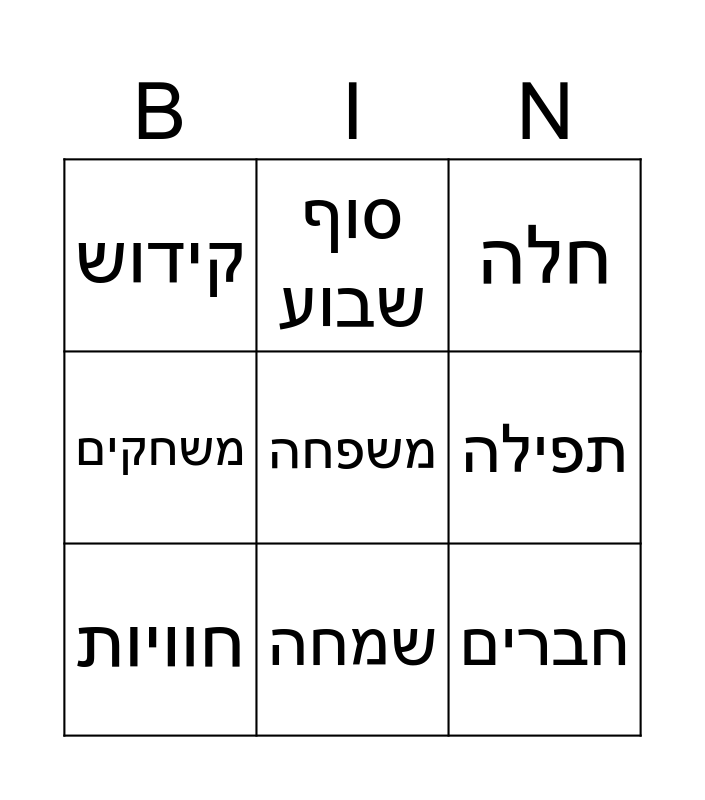 This bingo card has a free space and 20 words: שבת, תירוש, חלה, נרות, ארוחת שבת, חברים, שירים, קידוש, שלווה, סוף שבוע, מנוחה, ברכות, תפילה, שלום עליכם, חוויות, אהבה, שמחה, משחקים, גיבוש and לבוש חגיגי.