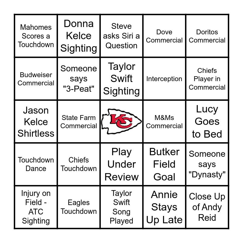 This bingo card has a free space and 24 words: Chiefs Touchdown, Eagles Touchdown, Taylor Swift Sighting, Injury on Field - ATC Sighting, Doritos Commercial, Mahomes Scores a Touchdown, Budweiser Commercial, Donna Kelce Sighting, M&Ms Commercial, Play Under Review, Interception, Jason Kelce Shirtless, Butker Field Goal, Someone says "Dynasty", Someone says "3-Peat", Annie Stays Up Late, Lucy Goes to Bed, Steve asks Siri a Question, Chiefs Player in Commercial, State Farm Commercial, Close Up of Andy Reid, Touchdown Dance, Dove Commercial and Taylor Swift Song Played.