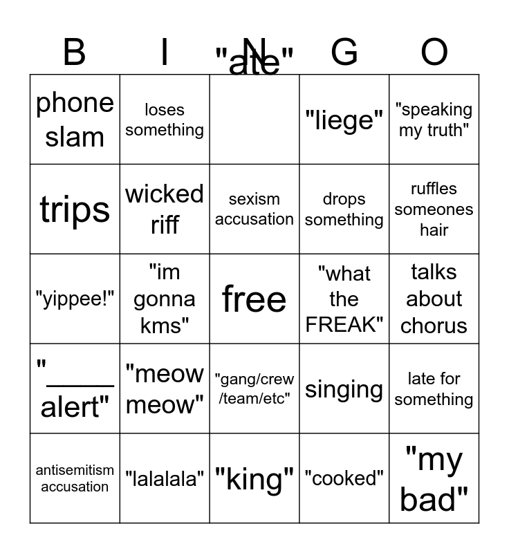 This bingo card has a free space and 24 words: "meow meow", "lalalala", sexism accusation, antisemitism accusation, "speaking my truth", phone slam, trips, loses something, "what the FREAK", "gang/crew /team/etc", drops something, "yippee!", singing, late for something, wicked riff, "cooked", talks about chorus, "ate", ruffles someones hair, "im gonna kms", "my bad", "____ alert", "liege" and "king".