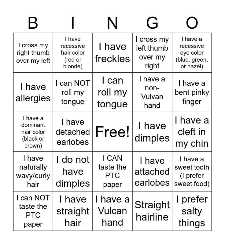 This bingo card has a free space and 24 words: I do not have dimples, I have straight hair, I can roll my tongue, I can NOT taste the PTC paper, I have a recessive eye color (blue, green, or hazel), I cross my right thumb over my left, I have allergies, I have recessive hair color (red or blonde), I have dimples, I CAN taste the PTC paper, I have a non-Vulvan hand, I have a dominant hair color (black or brown), I have attached earlobes, I have a sweet tooth (I prefer sweet food), I can NOT roll my tongue, Straight hairline, I have a cleft in my chin, I have freckles, I have a bent pinky finger, I have detached earlobes, I prefer salty things, I have naturally wavy/curly hair, I cross my left thumb over my right and I have a Vulcan hand.
