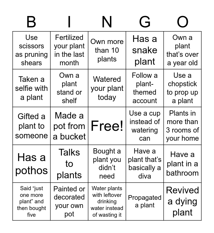 This bingo card has a free space and 40 words: Has a succulent, Gifted a plant to someone, Repotted a plant recently, Own a plant stand or shelf, Painted or decorated your own pot, Bought a plant you didn’t need, Watered your plant today, Own a pot shaped like a face, Own a plant that’s over a year old, Has a pothos, Made a pot from a bucket, Has a snake plant, Revived a dying plant, Plants in more than 3 rooms of your home, Use a cup instead of watering can, Talks to plants, Gave a plant a name, Use scissors as pruning shears, Have at least one terracotta pot, Own more than 10 plants, Have a plant in a bathroom, Propagated a plant, Follow a plant-themed account, Taken a selfie with a plant, Used a toothbrush for leaf cleaning, Has a macrame plant hanger, Constantly checks on plants, Has a cactus, Own a self-watering pot, Googled “why is my plant dying”, Accidentally created a jungle at home, Said “just one more plant” and then bought five, Accidentally broke a pot, Have a plant that’s basically a diva, Use a chopstick to prop up a plant, Water plants with leftover drinking water instead of wasting it, Use a food container instead of a propagation station, Has a monstera, Fertilized your plant in the last month and Rescued or revived a dying plant.