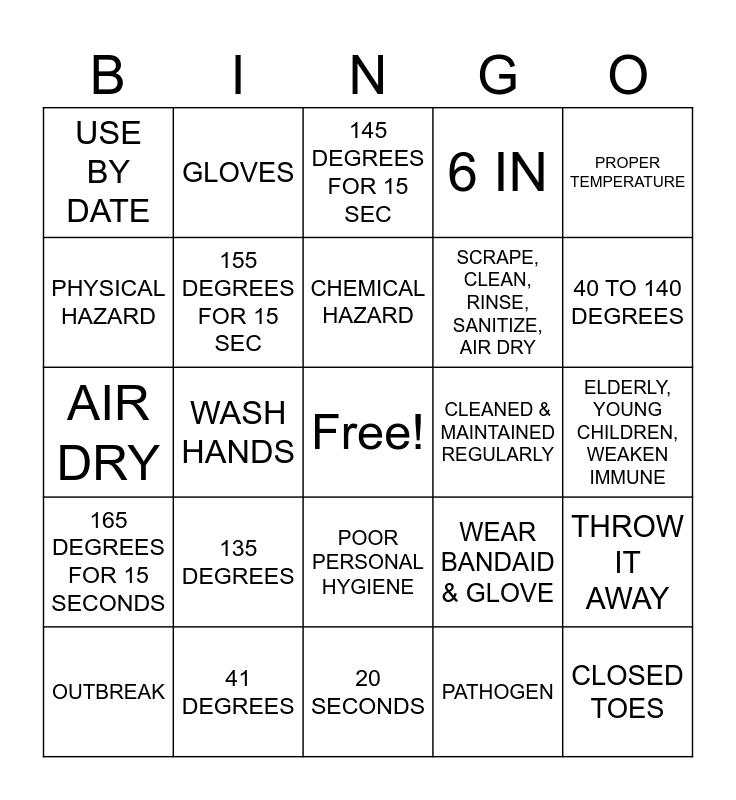This bingo card has a free space and 29 words: OUTBREAK, CLEANING & SANITIZING, WASH HANDS, LABELED DATED, USE BY DATE, 145 DEGREES FOR 15 SEC, 155 DEGREES FOR 15 SEC, 135 DEGREES, CLEANED & MAINTAINED REGULARLY, 41 DEGREES, ELDERLY, YOUNG CHILDREN, WEAKEN IMMUNE, CLOSED TOES, 20 SECONDS, PATHOGEN, 40 TO 140 DEGREES, USE DIFFERENT CUTTING BOARDS, POOR PERSONAL HYGIENE, 165 DEGREES FOR 15 SECONDS, PROPER TEMPERATURE, AIR DRY, WEAR BANDAID & GLOVE, RINSE & WASH, SCRAPE, CLEAN, RINSE, SANITIZE, AIR DRY, PHYSICAL HAZARD, 6 IN, GLOVES, THROW IT AWAY, CHEMICAL HAZARD and FOOD HAZARD.
