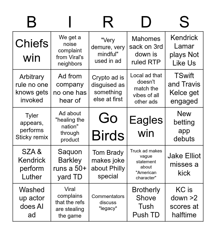 This bingo card has a free space and 24 words: Saquon Barkley runs a 50+ yard TD, Viral complains that the refs are stealing the game, Crypto ad is disguised as something else at first, Washed up actor does AI ad, Kendrick Lamar plays Not Like Us, Chiefs win, Arbitrary rule no one knows gets invoked, We get a noise complaint from Viral's neighbors, Eagles win, Tom Brady makes joke about Philly special, Local ad that doesn't match the vibes of all other ads, Tyler appears, performs Sticky remix, Truck ad makes vague statement about "American character", Jake Elliot misses a kick, Ad from company no one has hear of, Brotherly Shove Tush Push TD, New betting app debuts, "Very demure, very mindful" used in ad, TSwift and Travis Kelce get engaged, Ad about "healing the nation" through product, KC is down >2 scores at halftime, SZA & Kendrick perform Luther, Mahomes sack on 3rd down is ruled RTP and Commentators discuss "legacy".