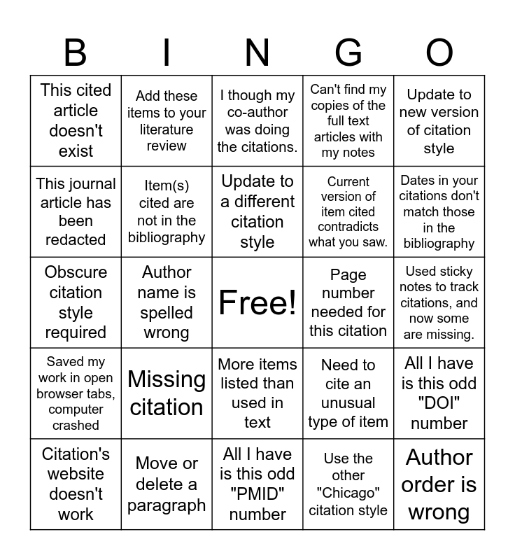 This bingo card has a free space and 24 words: Missing citation, Move or delete a paragraph, Update to a different citation style, Citation's website doesn't work, Update to new version of citation style, This cited article doesn't exist, This journal article has been redacted, Add these items to your literature review, Page number needed for this citation, More items listed than used in text, Current version of item cited contradicts what you saw., Obscure citation style required, Need to cite an unusual type of item, All I have is this odd "DOI" number, Item(s) cited are not in the bibliography, Use the other "Chicago" citation style, Used sticky notes to track citations, and now some are missing., I though my co-author was doing the citations., Dates in your citations don't match those in the bibliography, Author name is spelled wrong, Author order is wrong, Saved my work in open browser tabs, computer crashed, Can't find my copies of the full text articles with my notes and All I have is this odd "PMID" number.