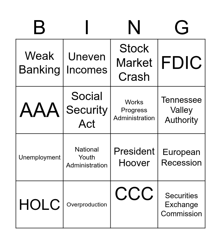 This bingo card has 16 words: Overproduction, European Recession, Stock Market Crash, Weak Banking, Unemployment, Uneven Incomes, President Hoover, CCC, AAA, Social Security Act, HOLC, FDIC, National Youth Administration, Tennessee Valley Authority, Works Progress Administration and Securities Exchange Commission.