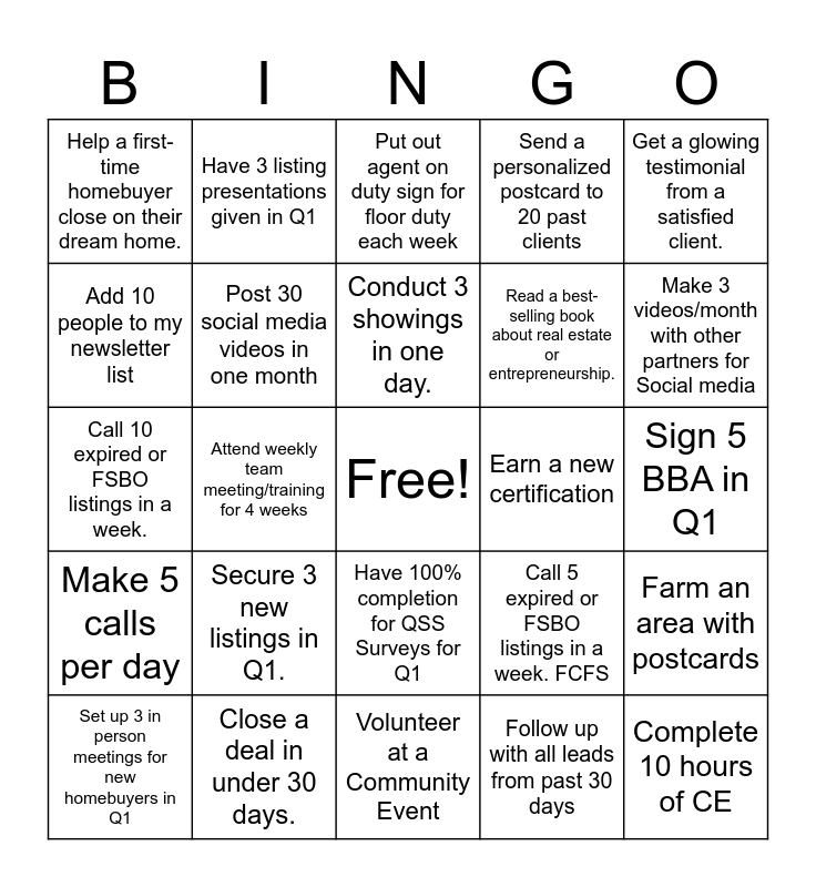 This bingo card has a free space and 24 words: Secure 3 new listings in Q1., Close a deal in under 30 days., Conduct 3 showings in one day., Set up 3 in person meetings for new homebuyers in Q1, Get a glowing testimonial from a satisfied client., Help a first-time homebuyer close on their dream home., Add 10 people to my newsletter list, Have 3 listing presentations given in Q1, Earn a new certification, Have 100% completion for QSS Surveys for Q1, Read a best-selling book about real estate or entrepreneurship., Call 10 expired or FSBO listings in a week., Call 5 expired or FSBO listings in a week. FCFS, Farm an area with postcards, Post 30 social media videos in one month, Follow up with all leads from past 30 days, Sign 5 BBA in Q1, Put out agent on duty sign for floor duty each week, Make 3 videos/month with other partners for Social media, Attend weekly team meeting/training for 4 weeks, Complete 10 hours of CE, Make 5 calls per day, Send a personalized postcard to 20 past clients and Volunteer at a Community Event.