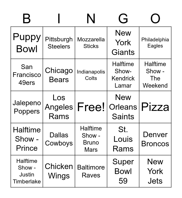 This bingo card has a free space and 47 words: Green Bay Packers, New York Jets, Kansas City Chiefs, Baltimore Raves, Dallas Cowboys, Miami Dolphins, Pittsburgh Steelers, Oakland Raiders, San Francisco 49ers, Washington Commanders, Chicago Bears, New York Giants, Denver Broncos, St. Louis Rams, New England Patriots, Tampa Bay Buccaneers, Indianapolis Colts, New Orleans Saints, Seattle Seahawks, Philadelphia Eagles, Los Angeles Rams, Super Bowl 59, Puppy Bowl, Halftime Show- Kendrick Lamar, Halftime Show - Usher, Halftime Show - The Weekend, Halftime Show - Justin Timberlake, Halftime Show- Lady Gaga, Halftime Show - Bruno Mars, Halftime Show - Prince, Halftime Show - Aerosmith and NSYNC, Halftime Show - The Blues Brothers, Halftime Show - Michael Jackson, Pigs in a Blanket, Potato Skins, Chicken Wings, Pizza, Chips and Dip, Nachos, Sliders, Chili, Mozzarella Sticks, Jalepeno Poppers, Quesadillas, Pasta Salad, Super Bowl Commercials and Hot Dogs.