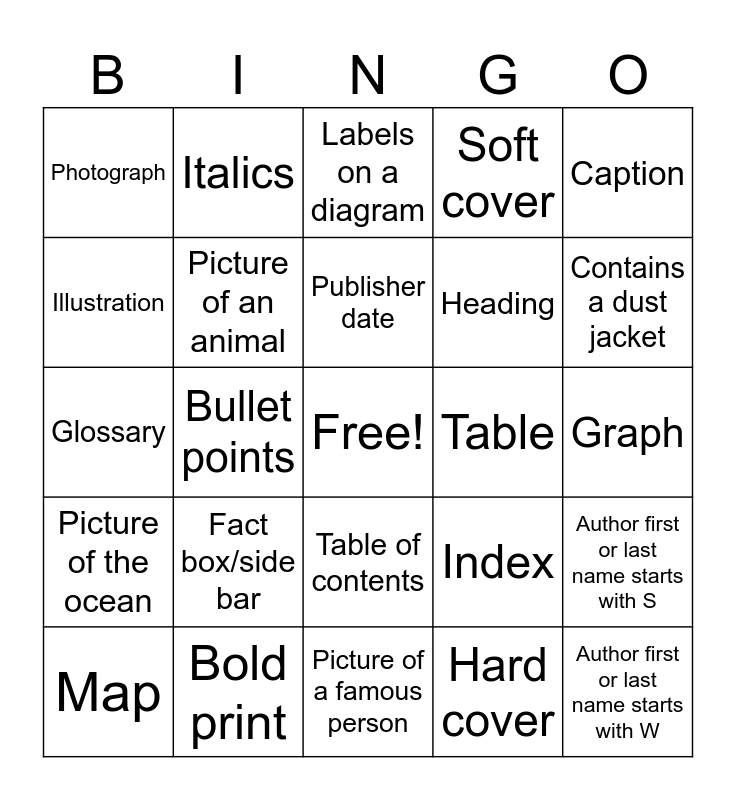 This bingo card has a free space and 24 words: Fact box/side bar, Bold print, Publisher date, Map, Caption, Photograph, Illustration, Italics, Table, Table of contents, Heading, Glossary, Index, Author first or last name starts with S, Picture of an animal, Hard cover, Graph, Labels on a diagram, Contains a dust jacket, Bullet points, Author first or last name starts with W, Picture of the ocean, Soft cover and Picture of a famous person.