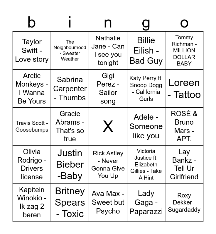 This bingo card has a free space and 32 words: Lady Gaga - Paparazzi, Nicki Minaj - Super bass, Gracie Abrams - That's so true, Taylor Swift - You belong with me, Olivia Rodrigo - Drivers license, Sabrina Carpenter - Thumbs, Tommy Richman - MILLION DOLLAR BABY, Lay Bankz - Tell Ur Girlfriend, The Neighbourhood - Sweater Weather, Tyla - Push 2 start, Gigi Perez - Sailor song, Nathalie Jane - Can I see you tonight, Ice Spice - Boy’s a Liar, Esko - Huts, Adele - Someone like you, Jojo Siwa - Karma, Kapitein Winokio - Ik zag 2 beren, Travis Scott - Goosebumps, Rick Astley - Never Gonna Give You Up, Justin Bieber -Baby, Victoria Justice ft. Elizabeth Gillies - Take A Hint, Lola Young - Messi, ROSÉ & Bruno Mars - APT., Britney Spears - Toxic, Roxy Dekker - Sugardaddy, Billie Eilish - Bad Guy, Katy Perry ft. Snoop Dogg - California Gurls, Arctic Monkeys - I Wanna Be Yours, Taylor Swift - Love story, Ava Max - Sweet but Psycho, Tyla - Pop like this and Loreen - Tattoo.