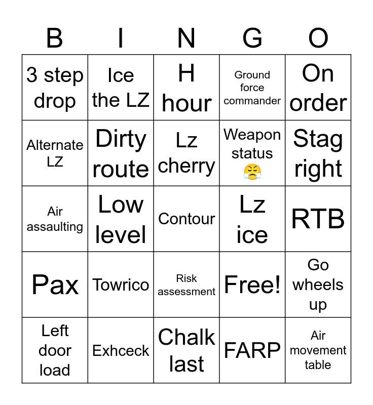 This bingo card has 25 words: Towrico, Chalk last, Lz cherry, Left door load, On order, 3 step drop, Alternate LZ, Ice the LZ, Lz ice, Risk assessment, Weapon status 😤, Air assaulting, Free!, Go wheels up, Dirty route, Air movement table, RTB, H hour, Stag right, Low level, Contour, Exhceck, Pax, Ground force commander and FARP.