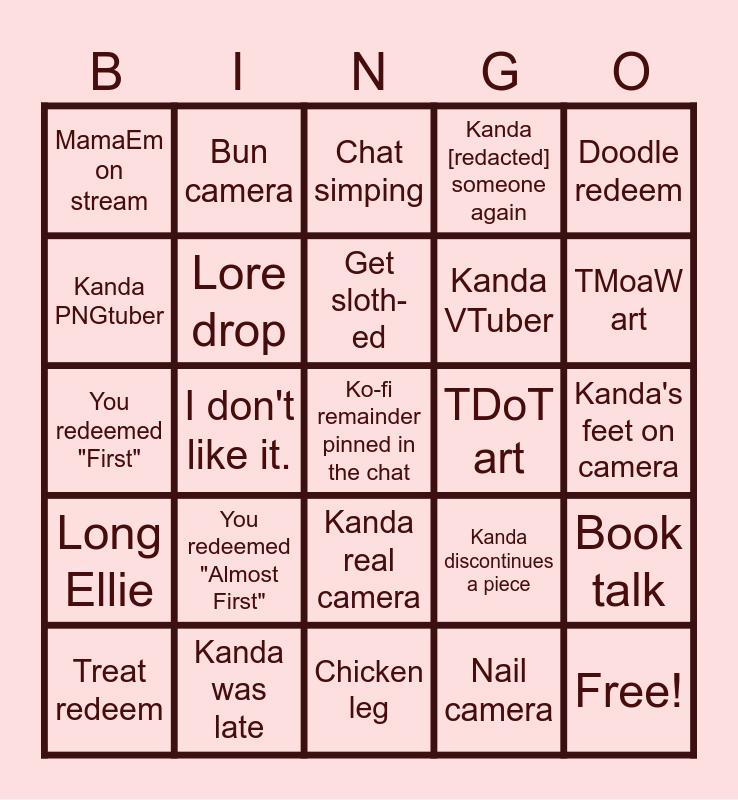 This bingo card has 33 words: Free!, PPs, I don't like it., Buns flopped, Long Ellie, Lore drop, Doodle redeem, Treat redeem, Bun camera, Finished a piece, Get sloth-ed, Chat simping, Happy train, Kanda drawing hands, TDoT art, TMoaW art, Kanda was late, You redeemed "First", You redeemed "Almost First", Kanda discontinues a piece, Kanda real camera, Pietro mentioned, MamaEm on stream, Kanda's feet on camera, Chicken leg, Ko-fi remainder pinned in the chat, Kanda [redacted] someone again, Kanda VTuber, Kanda PNGtuber, Book talk, Kanda drawing lots of hair, Nail camera and Kanda gets raided.