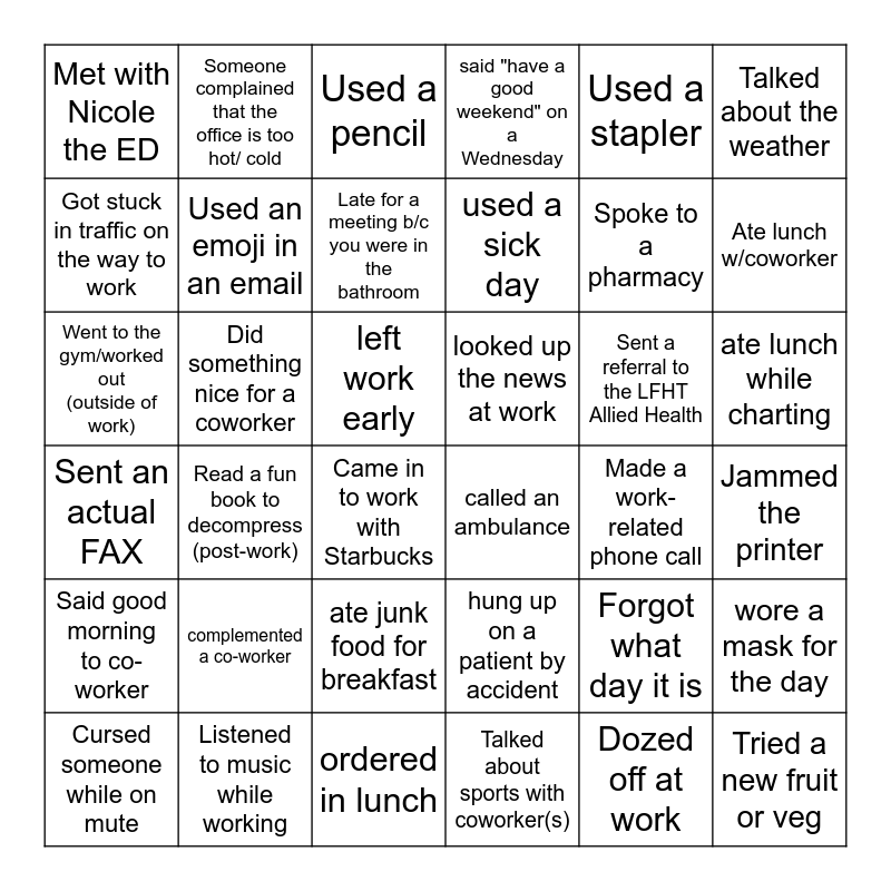 This bingo card has 52 words: Hit the snooze button twice, Went to the gym/worked out (outside of work), Saw that someone got a haircut, Made a work-related phone call, Sent a referral to the LFHT Allied Health, Talked about sports with coworker(s), Someone complained that the office is too hot/ cold, Received a personal call at work, Talked about the weather, Dozed off at work, Got stuck in traffic on the way to work, Listened to music while working, Read a fun book to decompress (post-work), Sent an actual FAX, Wore PJs while working from home, Cursed someone while on mute, Used an emoji in an email, Did something nice for a coworker, Free!, Used a stapler, Ate lunch w/coworker, Jammed the printer, Met with Nicole the ED, Late for a meeting b/c you were in the bathroom, Drank more than 4 cups of water in one day, Said good morning to co-worker, hung up on a patient by accident, Watched a show/ movie on your phone, used a sick day, ate junk food for breakfast, called ITSG for computer help, said "have a good weekend" on a Wednesday, Spoke on the phone to a co-worker from a different LFHT office, Had a meeting that could have been a phone call, Forgot what day it is, Used a pencil, called an ambulance, ordered in lunch, Tried a new fruit or veg, attended a lunch and learn, left work late, left work early, looked up the news at work, fixed something by turning it off and on again, ate lunch while charting, complemented a co-worker, wore a mask for the day, Spoke to a pharmacy, Collaborated on patient care, Came into work with Tim's, Came in to work with Starbucks and had salad for lunch.