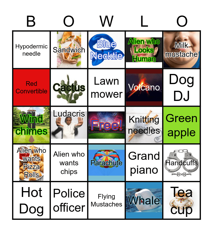 This bingo card has 36 images, a free space and 64 words: Banjo, Jet pack, Orange ball cap, Handcuffs, Pink bucket hat, Waterslide, Sandwich, Chef hat, Lawn mower, Blue cooler, Parachute, Kool-Aid Man, Green apple, Milk mustache, Clydesdale Foal, Red Convertible, Ludacris, Hypodermic needle, Pickleball Game, Volcano, Alien who wants chips, Alien who wants Pizza Rolls, Alien who Looks Human, UFO, Salad Bowl, Croutons, Fuzzy green coat, White Tiger, Hay bale, Donkey, Cheerleader, Decorated Guitar, Trash can, Ski goggles, Dog DJ, Hot Dog, Angel, Whale, Drive-thru, Cactus, Wind chimes, Knitting needles, Pacific Costal Highway, Spray paint, Bingo Game, Tea cup, Police officer, Wig, Grand piano, Orlando Bloom, Pickle jar, Sloth, Flying Mustaches, Duct tape, dog in a costume, Jolly Green Giant, Blue Necktie, Baby, Tractor, Snoop, Martha, Doja Cat, elevator and Ice Cream.