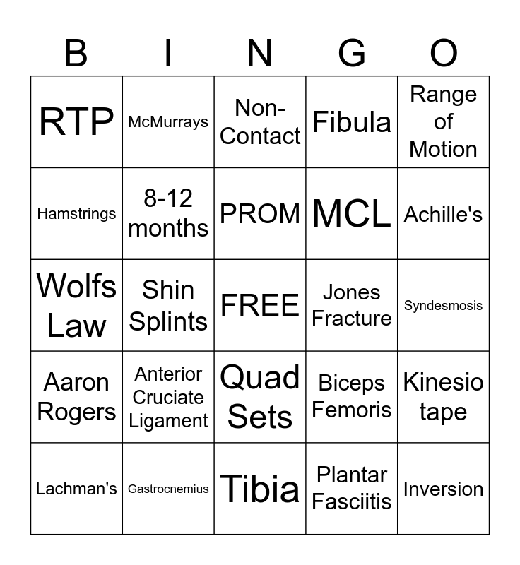 This bingo card has a free space and 29 words: Lachman's, Basketball, Shin Splints, Biomechanical Factors, RTP, Non-Contact, 8-12 months, Anterior Cruciate Ligament, Jones Fracture, Gastrocnemius, Syndesmosis, Inversion, Tibia, Plantar Fasciitis, Achille's, Jumper's Knee, Quad Sets, Aaron Rogers, Range of Motion, Wolfs Law, Biceps Femoris, Patella, MCL, Hamstrings, Fibula, McMurrays, Kinesio tape, PROM and Shoes.