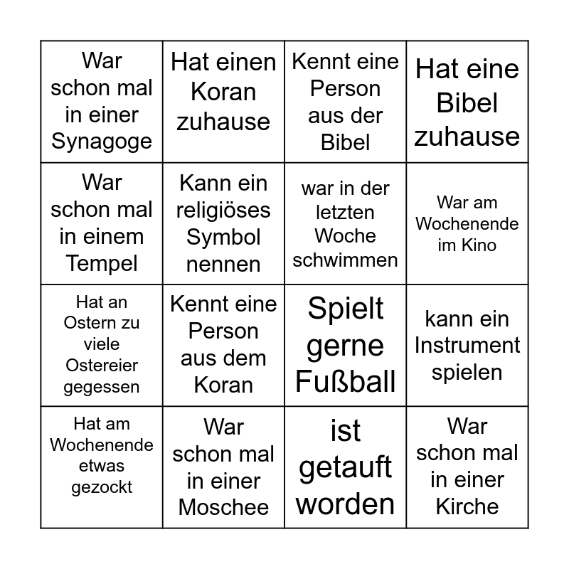 This bingo card has 16 words: War schon mal in einer Moschee, kann ein Instrument spielen, Kennt eine Person aus der Bibel, War schon mal in einer Synagoge, Hat an Ostern zu viele Ostereier gegessen, Hat einen Koran zuhause, Spielt gerne Fußball, ist getauft worden, War schon mal in einem Tempel, Kann ein religiöses Symbol nennen, Hat am Wochenende etwas gezockt, Hat eine Bibel zuhause, Kennt eine Person aus dem Koran, War am Wochenende im Kino, war in der letzten Woche schwimmen and War schon mal in einer Kirche.