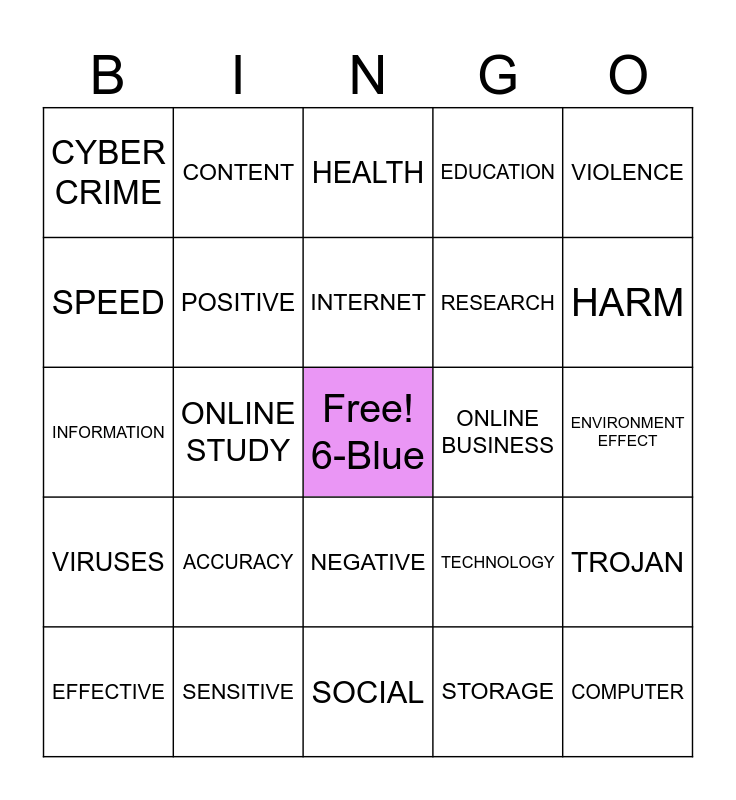 This bingo card has a free space and 24 words: ACCURACY, SENSITIVE, INTERNET, EFFECTIVE, VIOLENCE, CYBER CRIME, SPEED, CONTENT, ONLINE BUSINESS, NEGATIVE, RESEARCH, INFORMATION, TECHNOLOGY, TROJAN, POSITIVE, STORAGE, ENVIRONMENT EFFECT, HEALTH, HARM, ONLINE STUDY, COMPUTER, VIRUSES, EDUCATION and SOCIAL.