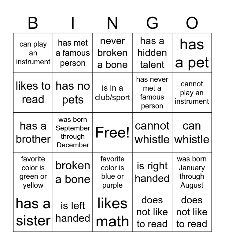 This bingo card has a free space and 24 words: broken a bone, is left handed, is in a club/sport, has a sister, has a pet, can play an instrument, likes to read, has met a famous person, cannot whistle, favorite color is blue or purple, has never met a famous person, has a brother, is right handed, was born January through August, has no pets, does not like to read, can whistle, never broken a bone, cannot play an instrument, was born September through December, does not like to read, favorite color is green or yellow, has a hidden talent and likes math.