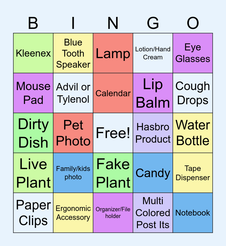 This bingo card has a free space and 24 words: Family/kids photo, Ergonomic Accessory, Calendar, Paper Clips, Eye Glasses, Kleenex, Mouse Pad, Blue Tooth Speaker, Hasbro Product, Fake Plant, Lip Balm, Dirty Dish, Candy, Tape Dispenser, Advil or Tylenol, Multi Colored Post Its, Water Bottle, Lamp, Cough Drops, Pet Photo, Notebook, Live Plant, Lotion/Hand Cream and Organizer/File holder.