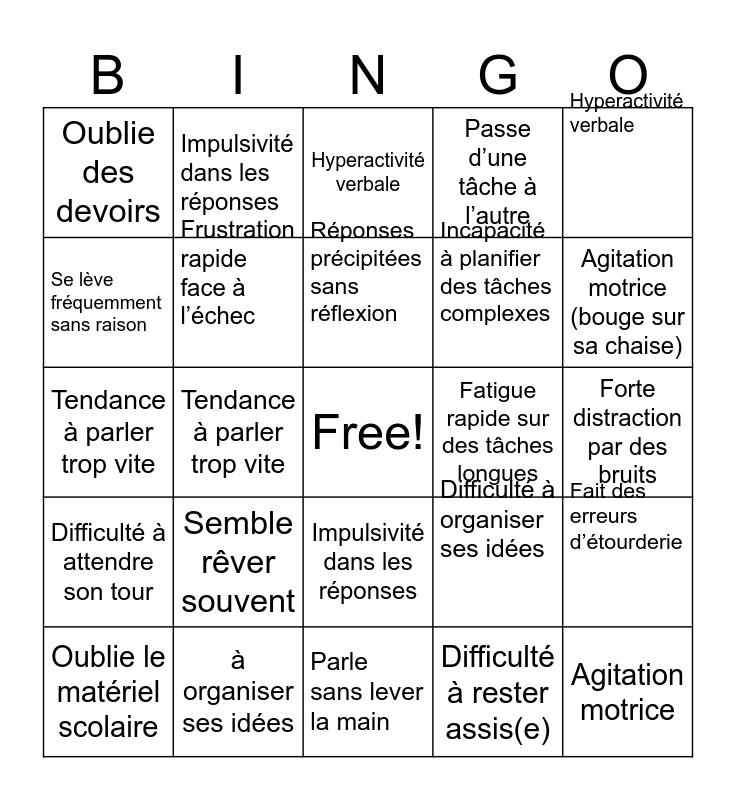This bingo card has a free space and 47 words: Oublie le matériel scolaire, Agitation motrice, Interrompt ses camarades, Parle sans lever la main, Semble rêver souvent, Travail inachevé, Impulsivité dans les réponses, Difficulté à attendre son tour, Se lève fréquemment sans raison, Perte rapide de concentration, Frustration rapide face à l’échec, Passe d’une tâche à l’autre, Fait des erreurs d’étourderie, Difficulté à organiser ses idées, Forte distraction par des bruits, Oublie les consignes données, Réponses précipitées sans réflexion, Fatigue rapide sur des tâches longues, Change souvent de position assise, Hyperactivité verbale, Tendance à parler trop vite, Difficulté à rester assis(e), Oublie des devoirs, Incapacité à planifier des tâches complexes, Interruption fréquente du professeur, Agitation motrice (bouge sur sa chaise), Oublie le matériel scolaire, Travail inachevé, Impulsivité dans les réponses, Difficulté à attendre son tour, Se lève fréquemment sans raison, Perte rapide de concentration, Frustration rapide face à l’échec, Passe d’une tâche à l’autre, Fait des erreurs d’étourderie, à organiser ses idées, Forte distraction par des bruits, Oublie les consignes données, Réponses précipitées sans réflexion, Fatigue rapide sur des tâches longues, Change souvent de position assise, Hyperactivité verbale, Tendance à parler trop vite, Difficulté à rester assis(e), Oublie des devoirs, Incapacité à planifier des tâches complexes and Interruption fréquente du professeur.