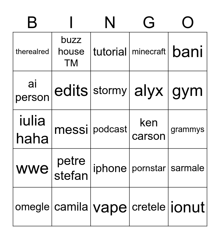 This bingo card has a free space and 24 words: petre stefan, camila, stormy, omegle, bani, therealred, ai person, buzz house TM, ken carson, iphone, alyx, iulia haha, pornstar, sarmale, edits, cretele, grammys, tutorial, gym, messi, ionut, wwe, minecraft and vape.