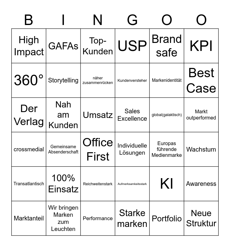 This bingo card has 36 words: Aufmerksamkeitsstark, Reichweitenstark, Starke marken, 360°, crossmedial, Sales Excellence, Storytelling, Performance, Brand safe, KI, Best Case, USP, Awareness, Nah am Kunden, Kundenversteher, High Impact, Transatlantisch, global(galaktisch), Der Verlag, Top-Kunden, Umsatz, Gemeinsame Absenderschaft, Individuelle Lösungen, Office First, Europas führende Medienmarke, GAFAs, Markenidentität, Wir bringen Marken zum Leuchten, näher zusammenrücken, KPI, Neue Struktur, Marktanteil, Wachstum, Markt outperformed, 100% Einsatz and Portfolio.