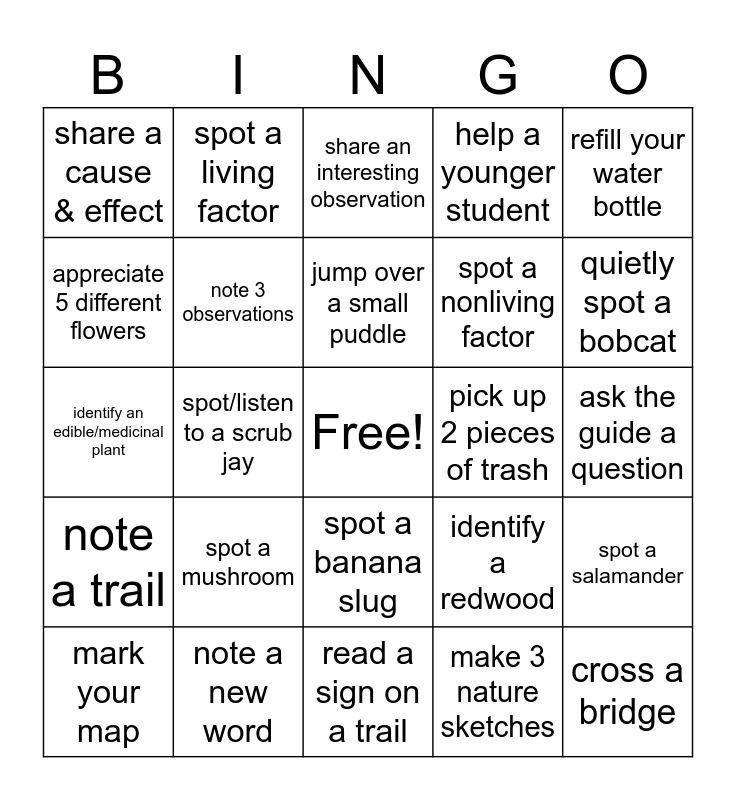 This bingo card has a free space and 24 words: spot a mushroom, note a new word, jump over a small puddle, mark your map, refill your water bottle, share a cause & effect, appreciate 5 different flowers, spot a living factor, pick up 2 pieces of trash, spot a banana slug, spot a nonliving factor, identify an edible/medicinal plant, identify a redwood, spot a salamander, note 3 observations, make 3 nature sketches, ask the guide a question, share an interesting observation, quietly spot a bobcat, spot/listen to a scrub jay, cross a bridge, note a trail, help a younger student and read a sign on a trail.