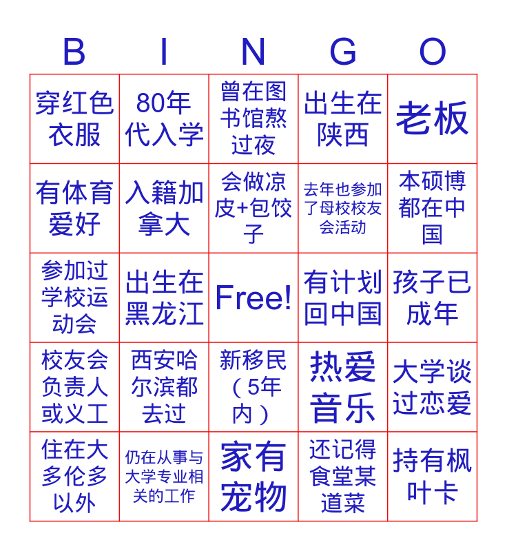 This bingo card has a free space and 39 words: 单身校友, 孩子未成年, 做过老师, 入籍加拿大, 住在大多伦多以外, 新移民(5年内), 会做凉皮+包饺子, 已退休, 老板, 校友会负责人或义工, 出生在黑龙江, 出生在陕西, 持有枫叶卡, 孩子已成年, 有计划回中国, 西安哈尔滨都去过, 西安交大、哈工大都有认识人, 穿红色衣服, 在加拿大读过书, 热爱音乐, 有体育爱好, 家有宠物, 去年也参加了母校校友会活动, 本硕博都在中国, 热爱电影, 会滑冰, 会讲西安讲, 会做肉夹馍或锅包肉, 吃过正宗五常大米, 80年代入学, 80后, 还记得学校的校训, 曾在图书馆熬过夜, 仍在从事与大学专业相关的工作, 还记得食堂某道菜, 毕业后回校探望过, 大学谈过恋爱, 参加过学校运动会 and 不后悔来加拿大.