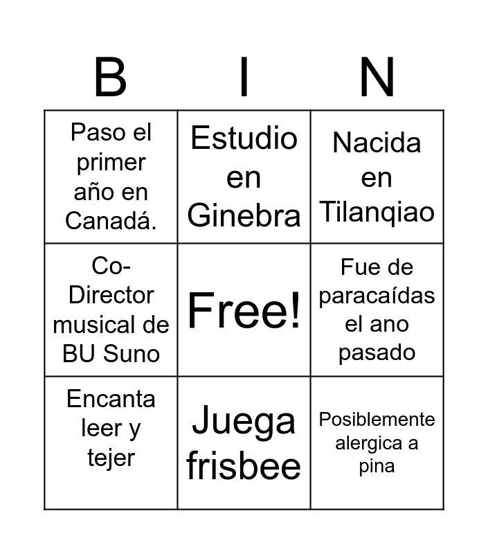 This bingo card has a free space and 8 words: Fue de paracaídas el ano pasado, Nacida en Tilanqiao, Estudio en Ginebra, Encanta leer y tejer, Paso el primer año en Canadá., Posiblemente alergica a pina, Co- Director musical de BU Suno and Juega frisbee.