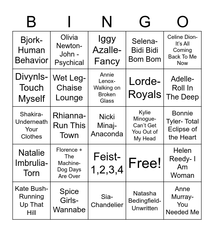 This bingo card has 27 words: Free!, Anne Murray- You Needed Me, Lorde- Royals, Sia- Chandelier, Divynls- Touch Myself, Iggy Azalle- Fancy, Olivia Newton- John - Psychical, Natalie Imbrulia- Torn, Kylie Minogue- Can’t Get You Out of My Head, Helen Reedy- I Am Woman, Shakira- Underneath Your Clothes, Selena- Bidi Bidi Bom Bom, Kate Bush- Running Up That Hill, Spice Girls- Wannabe, Adelle- Roll In The Deep, Amy Winehouse- Back To Black, Wet Leg- Chaise Lounge, Annie Lenox- Walking on Broken Glass, Florence + The Machine- Dog Days Are Over, Bjork- Human Behavior, Bonnie Tyler- Total Eclipse of the Heart, Natasha Bedingfield- Unwritten, Rhianna- Run This Town, Nicki Minaj- Anaconda, Feist- 1,2,3,4, Celine Dion- It’s All Coming Back To Me Now and Nelly Furtado- I’m Like A Bird.
