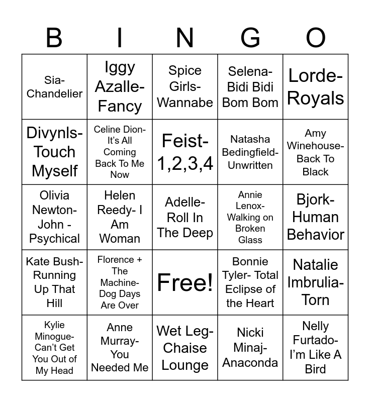 This bingo card has 26 words: Free!, Nicki Minaj- Anaconda, Feist- 1,2,3,4, Anne Murray- You Needed Me, Lorde- Royals, Sia- Chandelier, Divynls- Touch Myself, Iggy Azalle- Fancy, Bjork- Human Behavior, Bonnie Tyler- Total Eclipse of the Heart, Natasha Bedingfield- Unwritten, Olivia Newton- John - Psychical, Natalie Imbrulia- Torn, Kylie Minogue- Can’t Get You Out of My Head, Helen Reedy- I Am Woman, Shakira- Underneath Your Clothes, Selena- Bidi Bidi Bom Bom, Kate Bush- Running Up That Hill, Spice Girls- Wannabe, Adelle- Roll In The Deep, Amy Winehouse- Back To Black, Wet Leg- Chaise Lounge, Annie Lenox- Walking on Broken Glass, Florence + The Machine- Dog Days Are Over, Celine Dion- It’s All Coming Back To Me Now and Nelly Furtado- I’m Like A Bird.