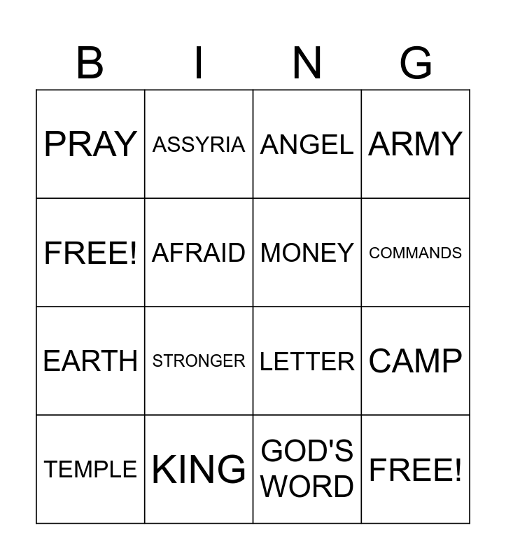 This bingo card has 16 words: KING, CAMP, ANGEL, PRAY, EARTH, ASSYRIA, LETTER, GOD'S WORD, FREE!, AFRAID, TEMPLE, ARMY, STRONGER, COMMANDS, MONEY and FREE!.