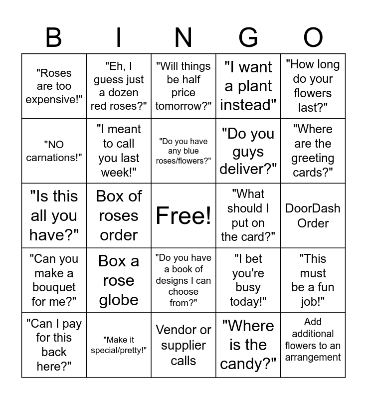 This bingo card has a free space and 24 words: Box a rose globe, "Make it special/pretty!", "Do you have any blue roses/flowers?", "Can I pay for this back here?", "How long do your flowers last?", "Roses are too expensive!", "NO carnations!", "Eh, I guess just a dozen red roses?", "What should I put on the card?", "Do you have a book of designs I can choose from?", "Do you guys deliver?", "Is this all you have?", "I bet you're busy today!", "This must be a fun job!", "I meant to call you last week!", "Where is the candy?", DoorDash Order, "Will things be half price tomorrow?", "Where are the greeting cards?", Box of roses order, Add additional flowers to an arrangement, "Can you make a bouquet for me?", "I want a plant instead" and Vendor or supplier calls.