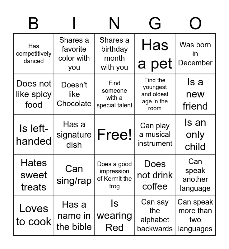 This bingo card has a free space and 24 words: Can sing/rap, Has a name in the bible, Find someone with a special talent, Loves to cook, Was born in December, Has competitively danced, Does not like spicy food, Shares a favorite color with you, Can play a musical instrument, Does a good impression of Kermit the frog, Find the youngest and oldest age in the room, Is left-handed, Does not drink coffee, Can speak another language, Doesn't like Chocolate, Can say the alphabet backwards, Is an only child, Shares a birthday month with you, Is a new friend, Has a signature dish, Can speak more than two languages, Hates sweet treats, Has a pet and Is wearing Red.