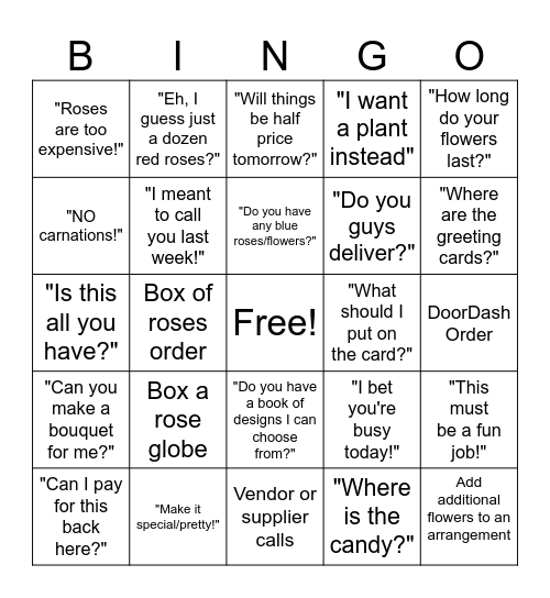This bingo card has a free space and 24 words: Box a rose globe, "Make it special/pretty!", "Do you have any blue roses/flowers?", "Can I pay for this back here?", "How long do your flowers last?", "Roses are too expensive!", "NO carnations!", "Eh, I guess just a dozen red roses?", "What should I put on the card?", "Do you have a book of designs I can choose from?", "Do you guys deliver?", "Is this all you have?", "I bet you're busy today!", "This must be a fun job!", "I meant to call you last week!", "Where is the candy?", DoorDash Order, "Will things be half price tomorrow?", "Where are the greeting cards?", Box of roses order, Add additional flowers to an arrangement, "Can you make a bouquet for me?", "I want a plant instead" and Vendor or supplier calls.