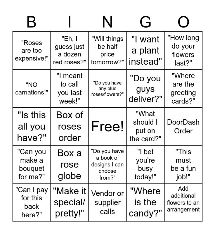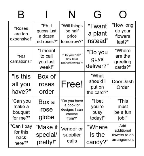 This bingo card has a free space and 24 words: Box a rose globe, "Make it special/ pretty!", "Do you have any blue roses/flowers?", "Can I pay for this back here?", "How long do your flowers last?", "Roses are too expensive!", "NO carnations!", "Eh, I guess just a dozen red roses?", "What should I put on the card?", "Do you have a book of designs I can choose from?", "Do you guys deliver?", "Is this all you have?", "I bet you're busy today!", "This must be a fun job!", "I meant to call you last week!", "Where is the candy?", DoorDash Order, "Will things be half price tomorrow?", "Where are the greeting cards?", Box of roses order, Add additional flowers to an arrangement, "Can you make a bouquet for me?", "I want a plant instead" and Vendor or supplier calls.