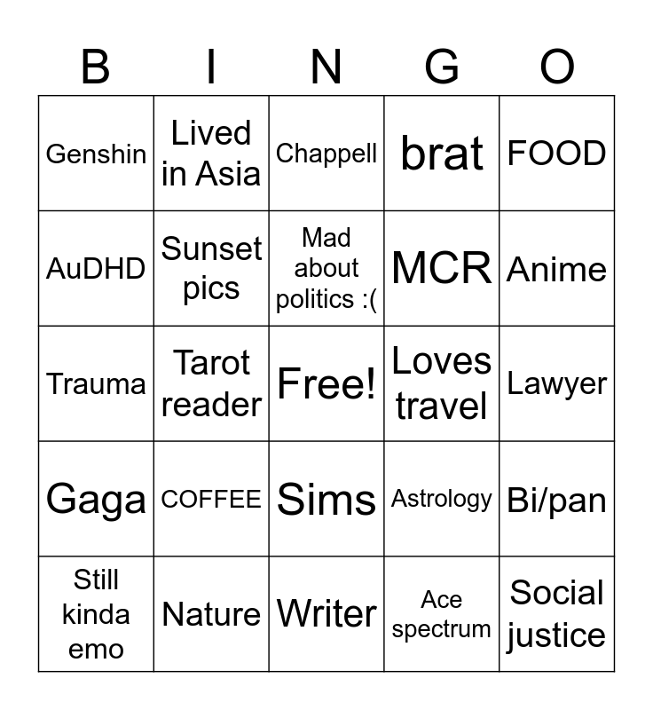 This bingo card has a free space and 24 words: COFFEE, Nature, Mad about politics :(, Still kinda emo, FOOD, Genshin, AuDHD, Lived in Asia, Loves travel, Sims, MCR, Trauma, Astrology, Bi/pan, Sunset pics, Ace spectrum, Lawyer, Chappell, Anime, Tarot reader, Social justice, Gaga, brat and Writer.