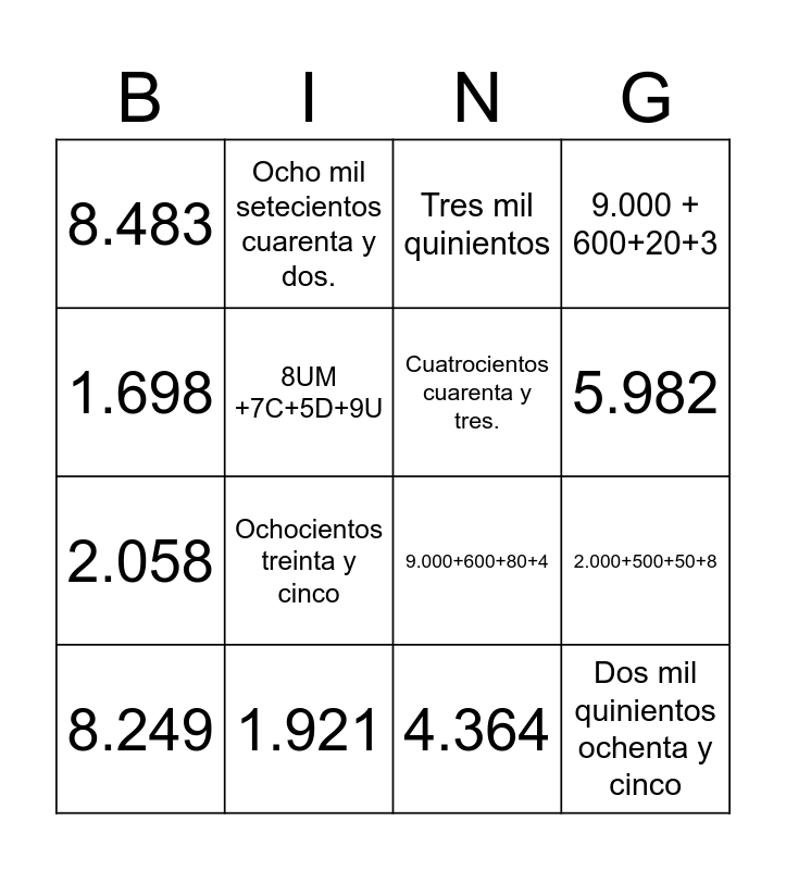 This bingo card has 16 words: 1.921, 2.000+500+50+8, Tres mil quinientos, 8.483, 2.058, Ocho mil setecientos cuarenta y dos., 9.000+600+80+4, 4.364, 1.698, 8UM +7C+5D+9U, 8.249, 9.000 + 600+20+3, Ochocientos treinta y cinco, 5.982, Cuatrocientos cuarenta y tres. and Dos mil quinientos ochenta y cinco.
