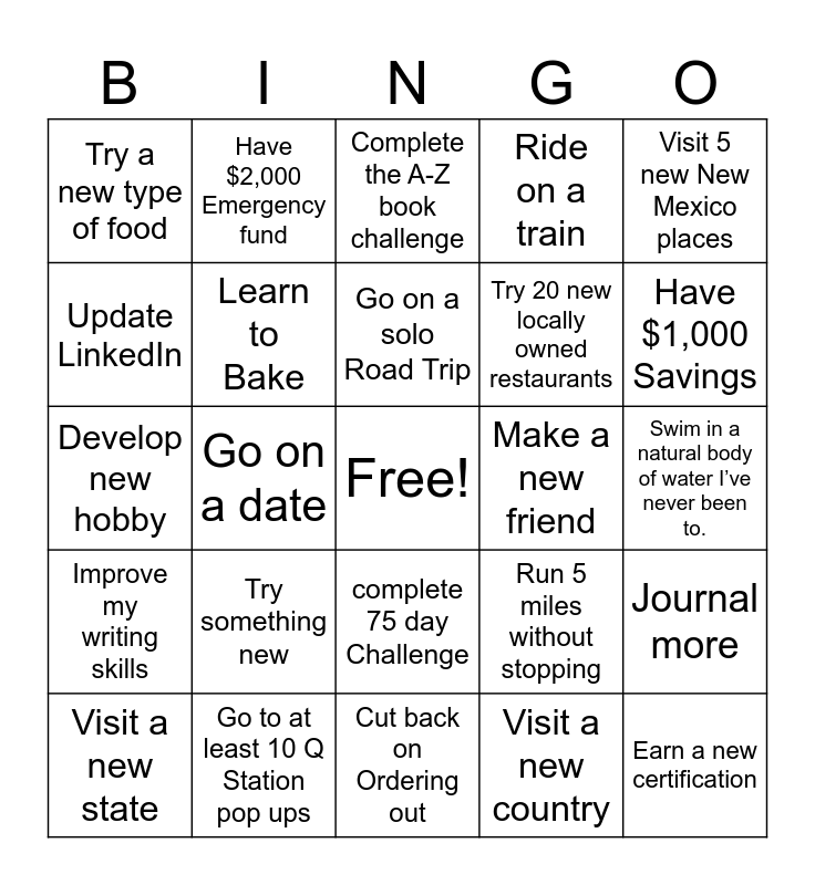 This bingo card has a free space and 24 words: Try something new, Go to at least 10 Q Station pop ups, Go on a solo Road Trip, Visit a new state, Visit 5 new New Mexico places, Try a new type of food, Update LinkedIn, Have $2,000 Emergency fund, Make a new friend, complete 75 day Challenge, Try 20 new locally owned restaurants, Develop new hobby, Run 5 miles without stopping, Journal more, Learn to Bake, Visit a new country, Swim in a natural body of water I’ve never been to., Complete the A-Z book challenge, Have $1,000 Savings, Go on a date, Earn a new certification, Improve my writing skills, Ride on a train and Cut back on Ordering out.