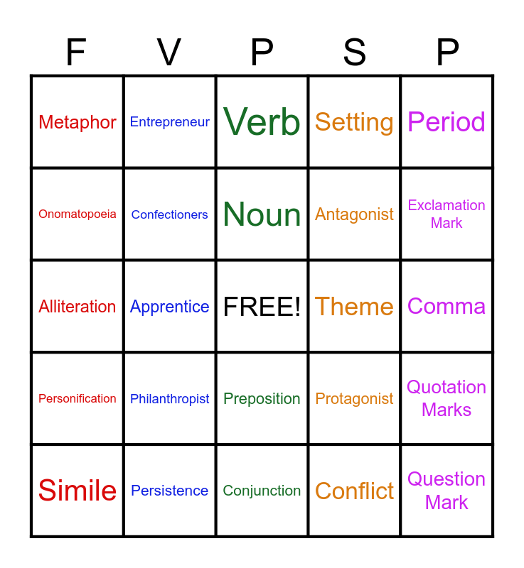 This bingo card has a free space and 24 words: Simile, Philanthropist, Noun, Conflict, Period, Metaphor, Entrepreneur, Verb, Theme, Comma, Alliteration, Confectioners, Protagonist, Quotation Marks, Onomatopoeia, Persistence, Conjunction, Setting, Exclamation Mark, Personification, Apprentice, Preposition, Antagonist and Question Mark.