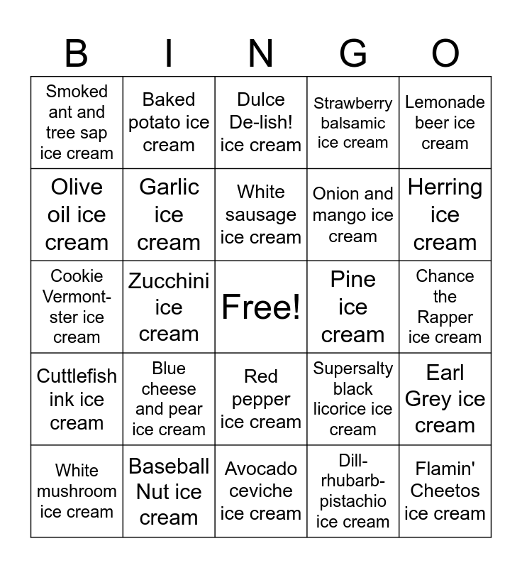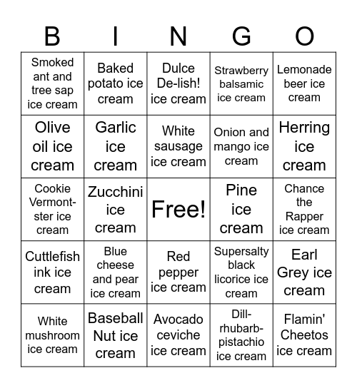 This bingo card has a free space and 49 words: Bacon ice cream, Flamin' Cheetos ice cream, Lobster ice cream, Avocado ceviche ice cream, Blue cheese and pear ice cream, Cinnamon toast ice cream, Baked potato ice cream, Honey lavender ice cream, Olive oil ice cream, Toasted coconut ice cream, Garlic ice cream, Strawberry balsamic ice cream, Earl Grey ice cream, Supersalty black licorice ice cream, Hot paprika ice cream, Brown bread ice, White sausage ice cream, Pine ice cream, Cloudberry ice cream, Lemonade beer ice cream, Zucchini ice cream, Dill-rhubarb-pistachio ice cream, Smoked ant and tree sap ice cream, Onion and mango ice cream, Tar ice cream, Herring ice cream, White mushroom ice cream, Gorgonzola ice cream, Red pepper ice cream, Cuttlefish ink ice cream, Whiskey ice cream, Mint ice cream, Birthday cake ice cream, Merlot ice cream, Baseball Nut ice cream, Cookie Monster ice cream, Pink bubblegum ice cream, Jamoca almond fudge ice cream, Chance the Rapper ice cream, Rosie's Batch Doggie ice cream, Impretzively Fudged ice cream, Marshmallow Sky ice cream, Cherry Garcia ice cream, Choco-lotta Cheesecake ice cream, Cookie Vermont-ster ice cream, Dulce De-lish! ice cream, Bossin' Cream Pie ice cream, Dirt cake ice cream and Phish Food ice cream.