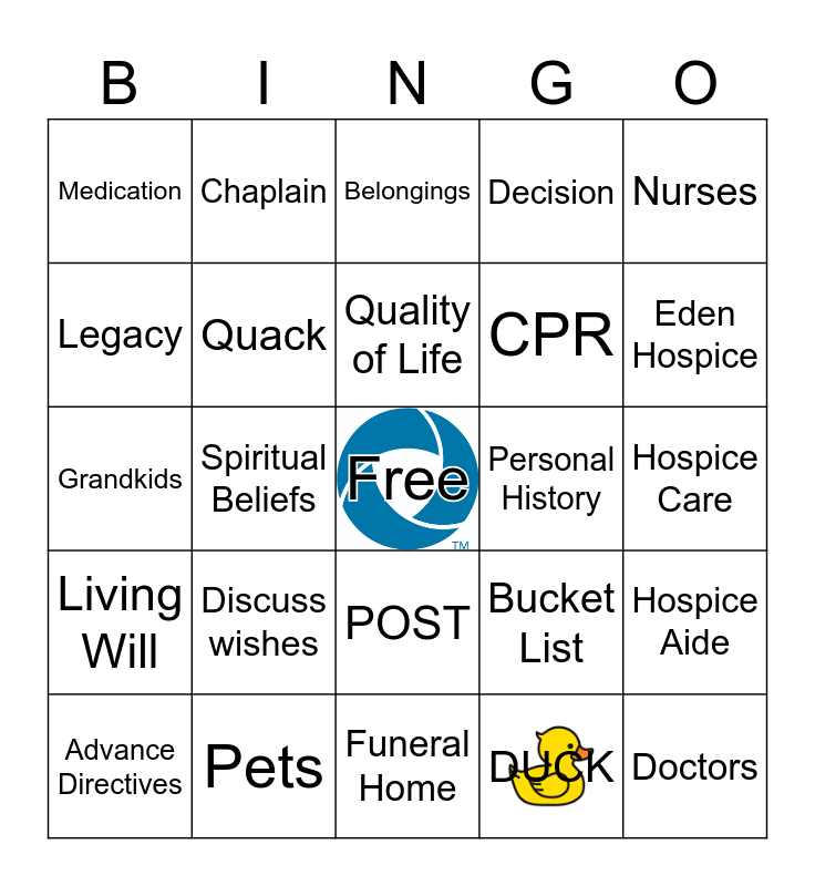 This bingo card has 1 images, a free space and 39 words: DNR, Full Code, Comfort, Quack, Advance Directives, POST, Quality of Life, End of life, Nurses, Living Will, Spiritual Beliefs, Decision, Doctors, Hospice Care, Personal History, Discuss wishes, Plan, Medication, Passions and Hobbies, Bucket List, Legacy, Funeral Home, CPR, Eden Hospice, Doctor visits, Hospital, Comfort care, Pain control, Home care, Chaplain, POA, What do YOU want?, Belongings, Pets, DUCK, Medical Social Worker, Hospice Aide, Grandkids and Family.