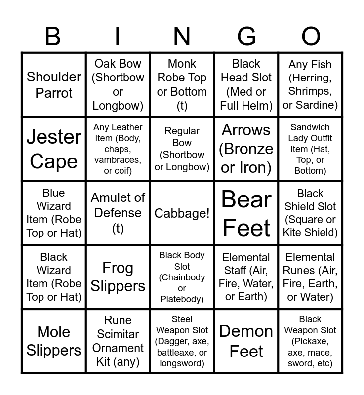 This bingo card has a free space and 25 words: Mole Slippers, Frog Slippers, Regular Bow (Shortbow or Longbow), Demon Feet, Sandwich Lady Outfit Item (Hat, Top, or Bottom), Shoulder Parrot, Oak Bow (Shortbow or Longbow), Monk Robe Top or Bottom (t), Arrows (Bronze or Iron), Elemental Runes (Air, Fire, Earth, or Water), Blue Wizard Item (Robe Top or Hat), Any Leather Item (Body, chaps, vambraces, or coif), Elemental Staff (Air, Fire, Water, or Earth), Black Weapon Slot (Pickaxe, axe, mace, sword, etc), Jester Cape, Rune Scimitar Ornament Kit (any), Steel Weapon Slot (Dagger, axe, battleaxe, or longsword), Black Head Slot (Med or Full Helm), Black Shield Slot (Square or Kite Shield), Black Wizard Item (Robe Top or Hat), Amulet of Defense (t), Black Body Slot (Chainbody or Platebody), Bear Feet, Any Fish (Herring, Shrimps, or Sardine) and Hardleather Body.