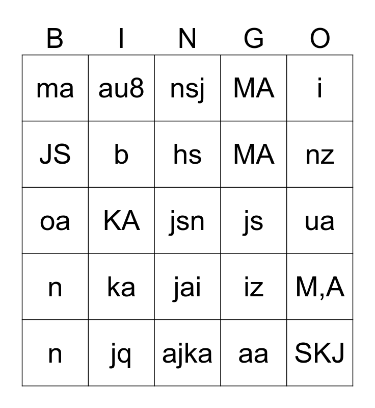 This bingo card has a free space and 34 words: a, aa, an, v, n, b, i, n, au8, aiy, hs, nsj, msn, js, js, nz, jq, oa, ka, iz, jai, ia, ma, ua, ajka, SKJ, MA, MZ, MA, JS, MA, KA, M,A and LA.