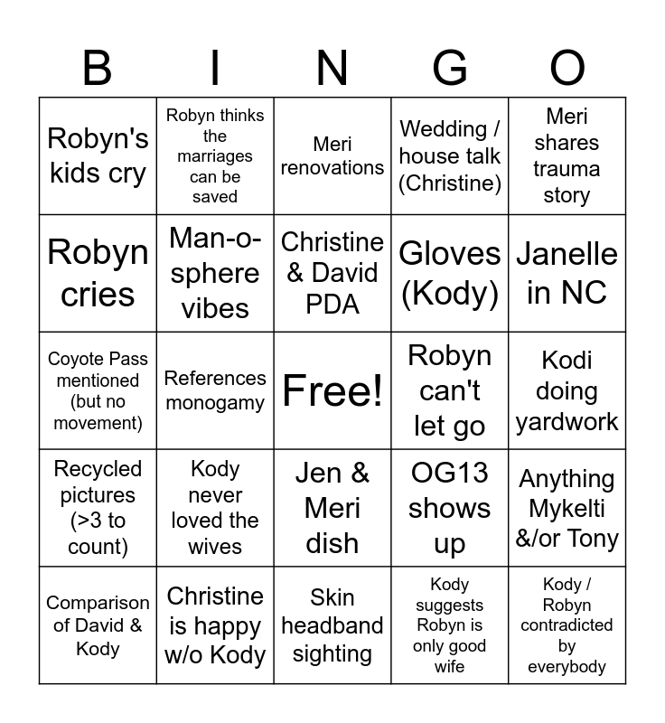 This bingo card has a free space and 24 words: Kody never loved the wives, Christine is happy w/o Kody, Christine & David PDA, Comparison of David & Kody, Meri shares trauma story, Robyn's kids cry, Robyn cries, Robyn thinks the marriages can be saved, Robyn can't let go, Jen & Meri dish, Gloves (Kody), Coyote Pass mentioned (but no movement), OG13 shows up, Anything Mykelti &/or Tony, Man-o-sphere vibes, Kody suggests Robyn is only good wife, Kodi doing yardwork, Meri renovations, Janelle in NC, References monogamy, Kody / Robyn contradicted by everybody, Recycled pictures (>3 to count), Wedding / house talk (Christine) and Skin headband sighting.