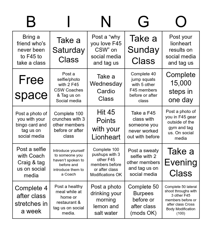 This bingo card has a free space and 29 words: Complete 4 after class stretches in a week, Share a fitness goal you have on social media and tag us, Complete 100 crunches with 3 other members before or after class, Post a muscle shot with a F45 Coach & tag us on Social Media, Bring a friend who's never been to F45 to take a class, Post a “why you love F45 CSW” on social media and tag us, Post a selfie/photo with 2 F45 CSW Coaches & Tag us on Social media, Introduce yourself to someone you haven’t spoken to before and introduce them to a Coach, Take a F45 class with someone you never worked out with before, Post a healthy meal while at home or restaurant & tag us on social media., Post a photo of you in F45 gear outside of the gym and tag us. On social media, Complete 50 lateral shoot throughs with 3 other F45 members before or after class Cross Body Modification (100), Post a photo drinking your morning lemon and salt water, Complete 50 Burpees before or after class (mods OK), Complete 15,000 steps in one day, Bring a coach a healthy treat, Complete 100 pushups with 3 other F45 members before or after class Modifications OK, Post a selfie with Coach Craig & tag us on social media, Post your lionheart results on social media and tag us, Post a photo of you with your bingo card and tag us on social media, Post a sweaty selfie with 2 other members and tag us on social media, Post a photo with you and 5 other F45 CSW members & tag us on Social media, Complete 40 jump squats with 5 other F45 members before or after class, Free space, Take a Sunday Class, Take a Saturday Class, Take a Evening Class, Take a Wednesday Cardio Class and Interview a coach and post on social media.