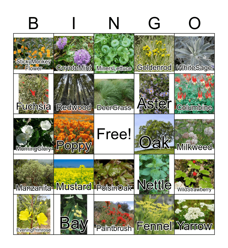 This bingo card has 30 images, a free space and 30 words: Bay, Buckwheat, Poppy, Lupine, StickyMonkey Flower, MinersLettuce, Redwood, PoisinOak, Oak, Paintbrush, Milkweed, Yarrow, Fennel, Sagebrush, Columbine, Sorrel, Nettle, Manzanita, Mustard, WhiteSage, MorningGlory, Iris, CoyoteMint, Aster, Fuchsia, Goldenrod, WildStrawberry, EveningPrimrose, DeerGrass and BushAnemone.