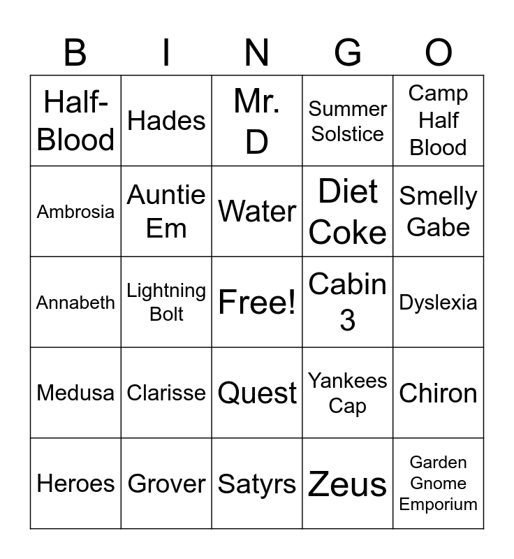 This bingo card has a free space and 41 words: Percy, Annabeth, Luke, Auntie Em, Grover, Quest, Water, Poseidon, Camp Half Blood, Medusa, Lightning Bolt, Summer Solstice, Garden Gnome Emporium, Dyslexia, Cabin 3, Clarisse, Sword fighting, Half-Blood, Trident, Mr. D, Chiron, Big Three, Satyrs, Diet Coke, The Oracle, Kronos, Zeus, The Attic, Smelly Gabe, Poker, Prophecy, Hades, Heroes, Drachmas, Yankees Cap, Ambrosia, Flying Shoes, Riptide, The Mist, Mrs. Dodds and Furies.