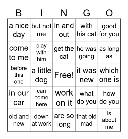 This bingo card has a free space and 44 words: the little boy, is about me, was to come, old and new, what we know, that old mad, in and out, not up here, good for you, down at work, with his cat, it was new, work on it, can come here, they will go, are so long, three of them, before this one, your little boy, as long as, but not me, here and there, from my mother, a nice day, make a book, which one is, this much is, about the frog, what do you, in our car, like the book, how do you, sit by them, he has it, a little dog, to the man, one, two,three, in or out, get the cat, come to me, he was going, by the house, play with him and yes and no.